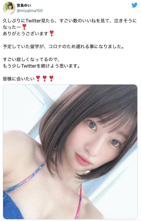 是怎样?今天SOD的官方twitter发文,告诉大家因为宫岛めい(宫岛芽衣)现在留学去不成了,有很多人希望这位只发了两片就引退的大学生回归战线;但到目前为止,宫岛めい(宫岛芽衣)还在犹豫不知道要不要回来多啪几下,所以请大家勤念咒语,给这位梦想成为幼教老师的大学生勇气: